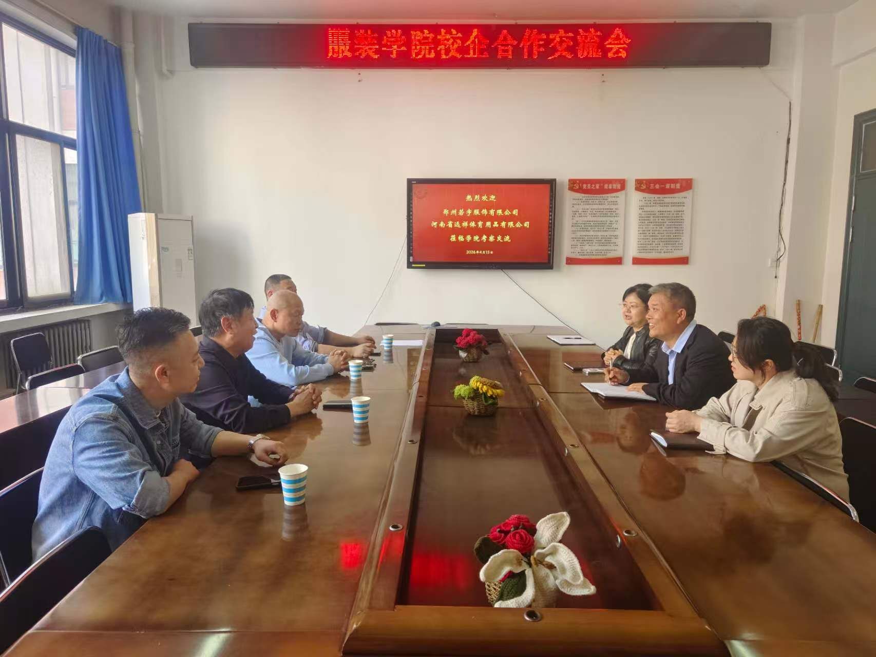 为进一步深化产教融合,拓展校企合作新路径,2026年4月15日上午,服装学院在11号楼204会议室召开校企合作交流会。郑州若宇服饰有限公司董事长赵志纯、河南远祥体育用品有限公司总经理祝方林、企业代表及服装学院班子成员参加会议。会议由学院党委书记游红伟主持。