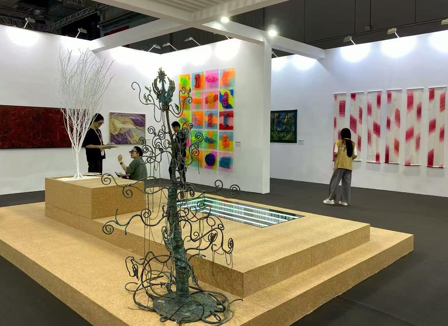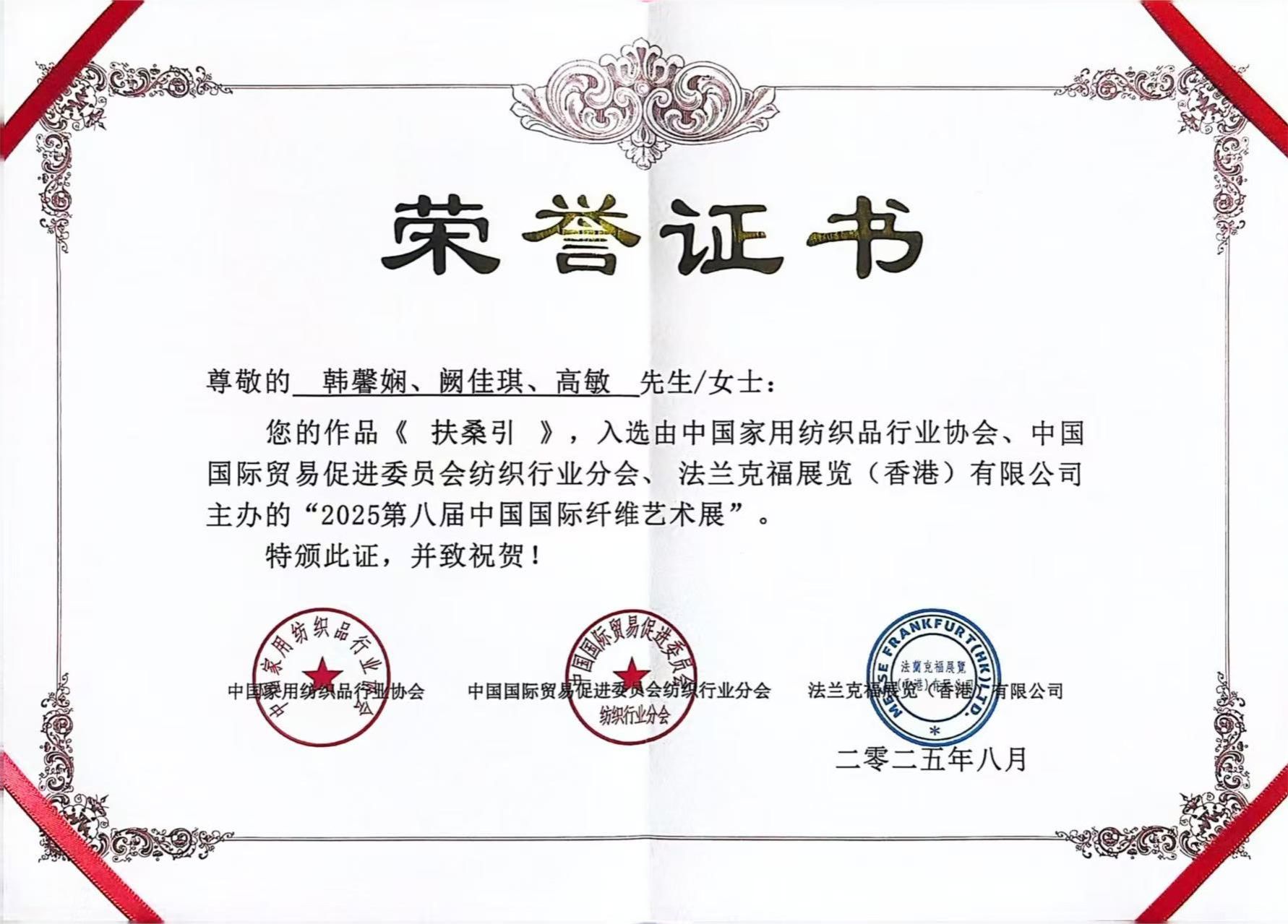 近日,2025年第八届中国国际纤维艺术展在国家会展中心(上海)盛大启幕。其中中国国际家用纺织品及辅料(秋冬)博览会的年度艺术展,以跨界融合的方式表达纤维材料在当代生活中的无限可能为主题,吸引了海内外40余位纤维艺术领域艺术家及设计师参加。服装学院教师韩馨娴指导本科生阙佳琪、高敏,凭借作品《扶桑引》成功入围并参展,作品立足纤维艺术的传统底蕴与当代创新,展现出扎实的专业基础与独特的创作思维。