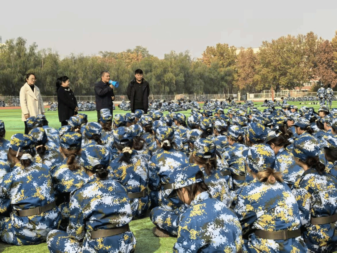 11月4日上午,服装学院党委书记游红伟、院长商亚敏、党委副书记高莉、全体辅导员一行前往军训场地,看望慰问承训教官和2025级参训新生。