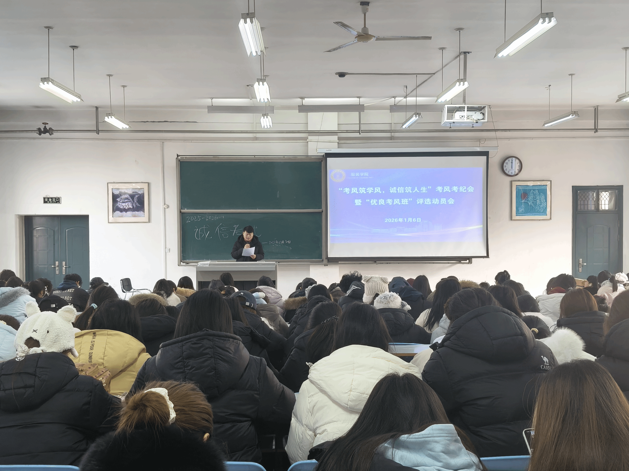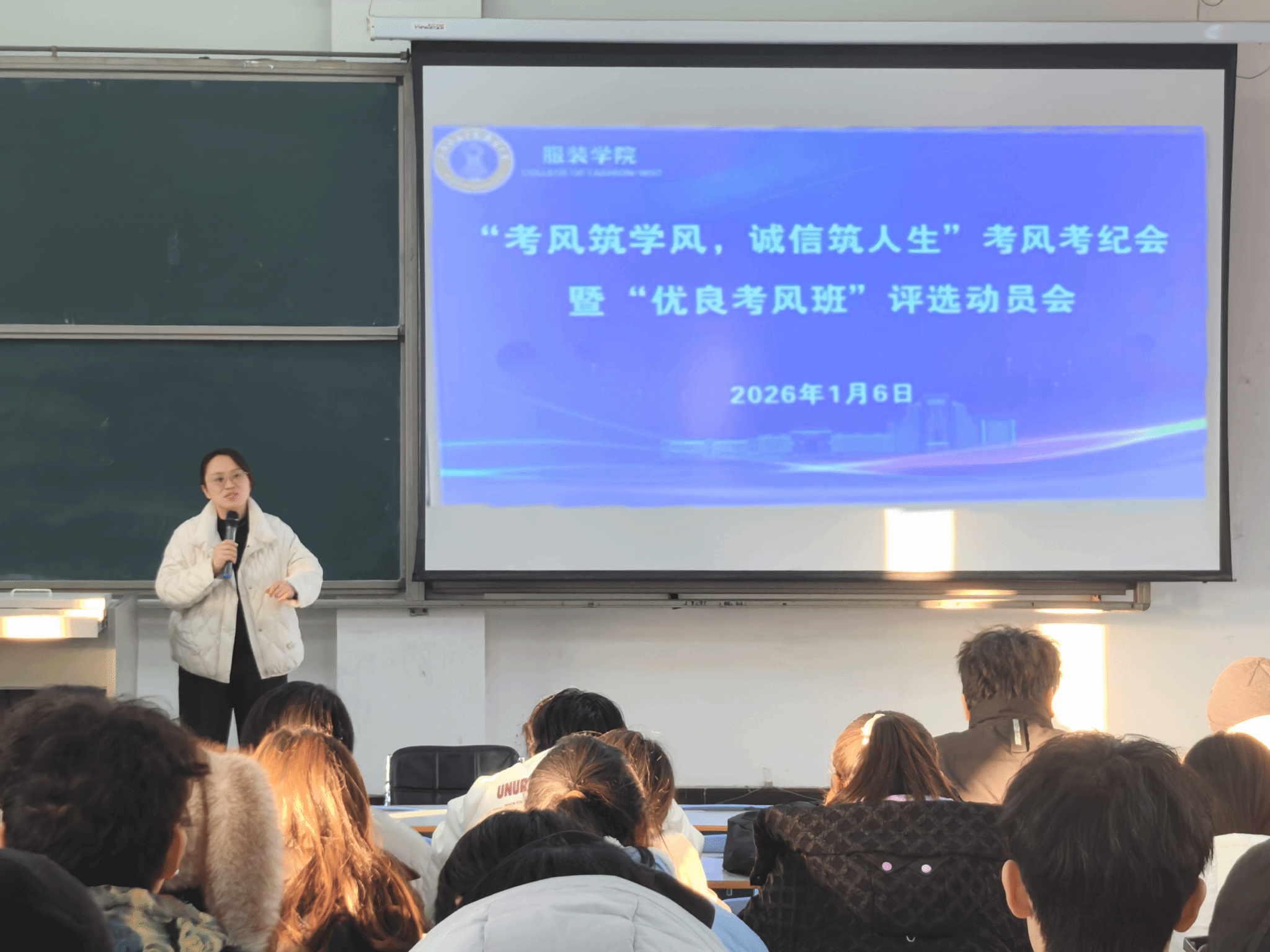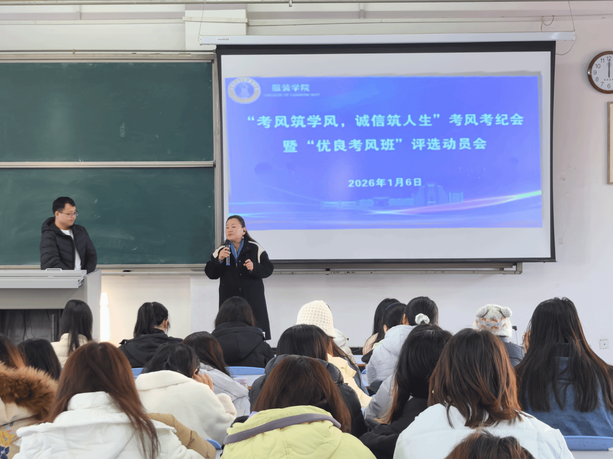 为提高学生诚信考试意识,严肃考风考纪,切实加强优良学风建设,1月6日服装学院在11合四教室分年级召开“考风筑学风,诚信筑人生”考风考纪会暨“优良考风班”评选动员会。服装学院党委副书记高莉、副院长郭海燕出席会议,各年级辅导员老师主持此次会议,学院全体学生参会。